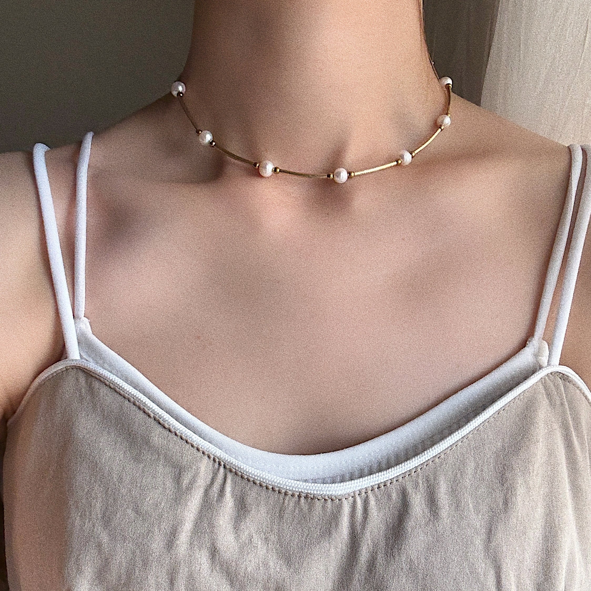 淡水パールと繊細なチューブパーツのネックレス。