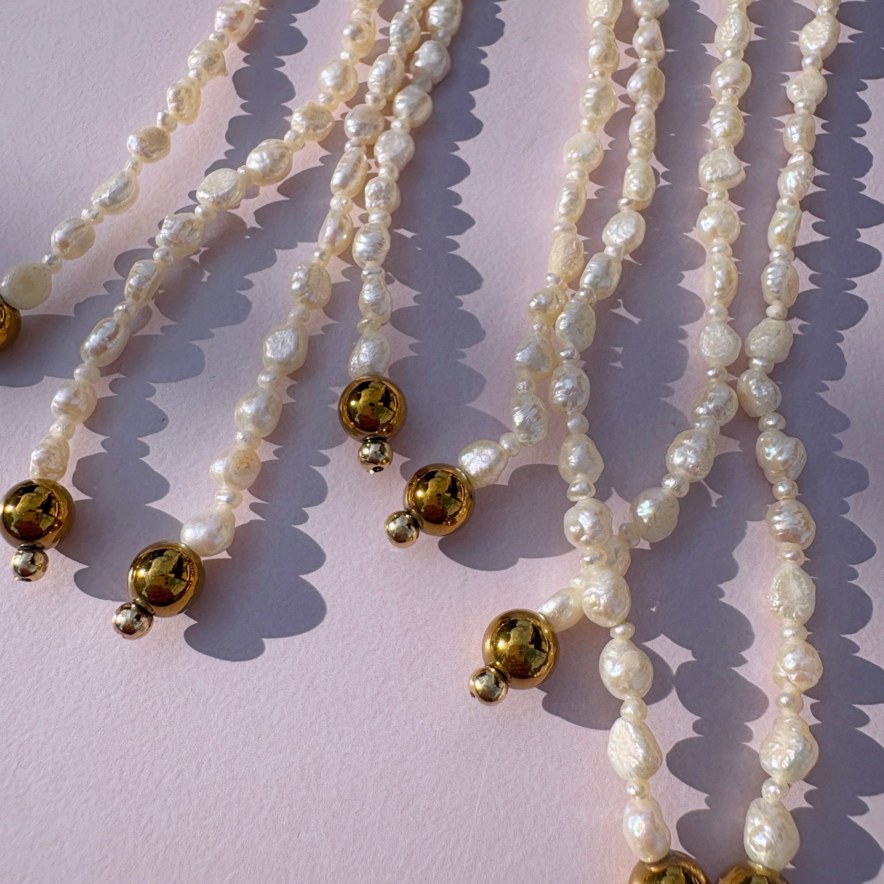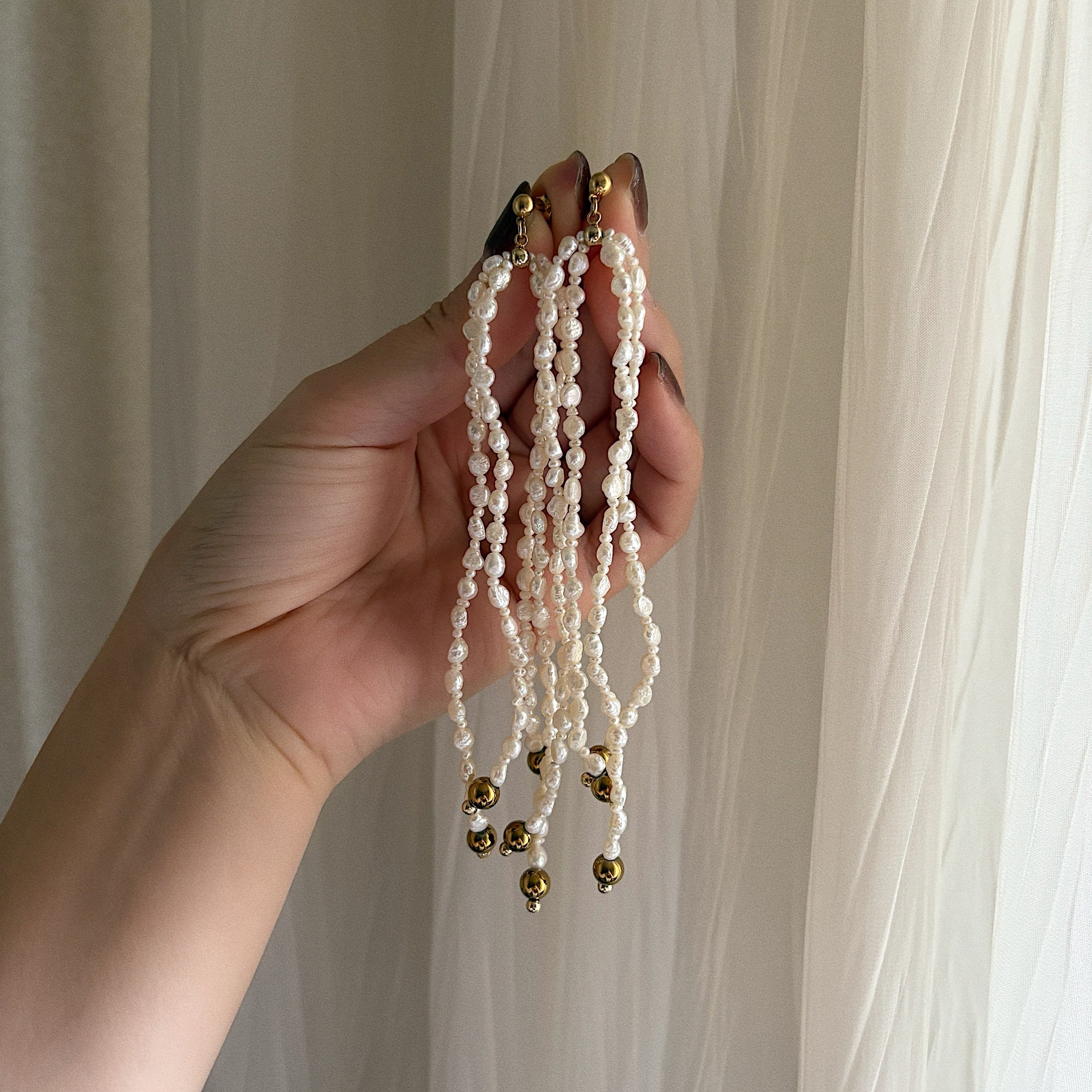 柔らかく光を弾く淡水パールを、繊細なラインに沿わせながら贅沢に連ねたロングデザイン。