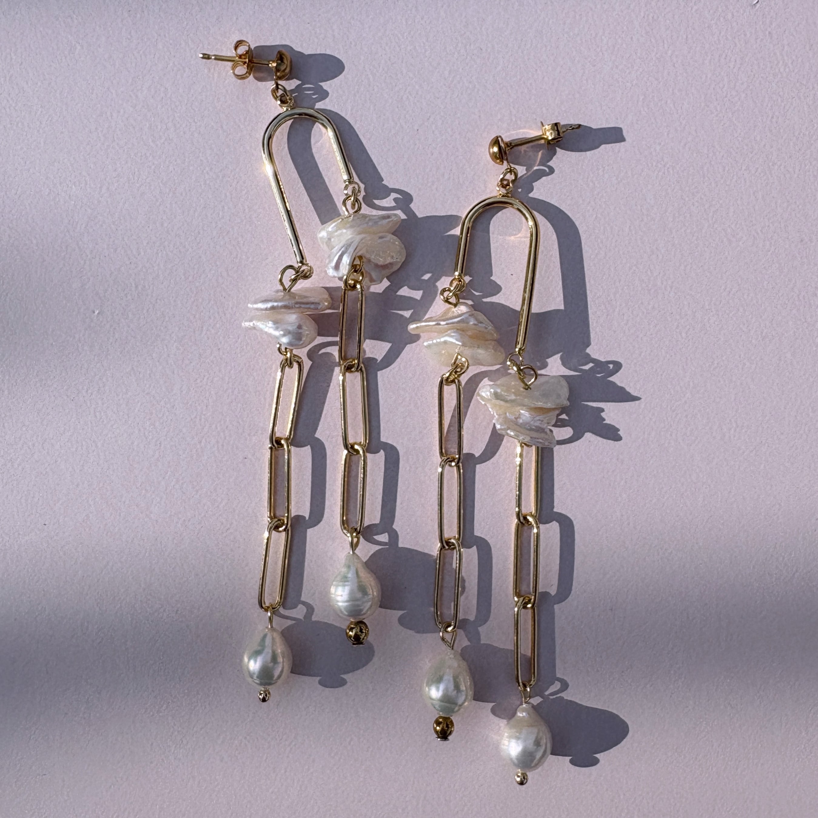 トップにはひとつひとつ形の異なるバロックパール、下には雫の淡水パール。