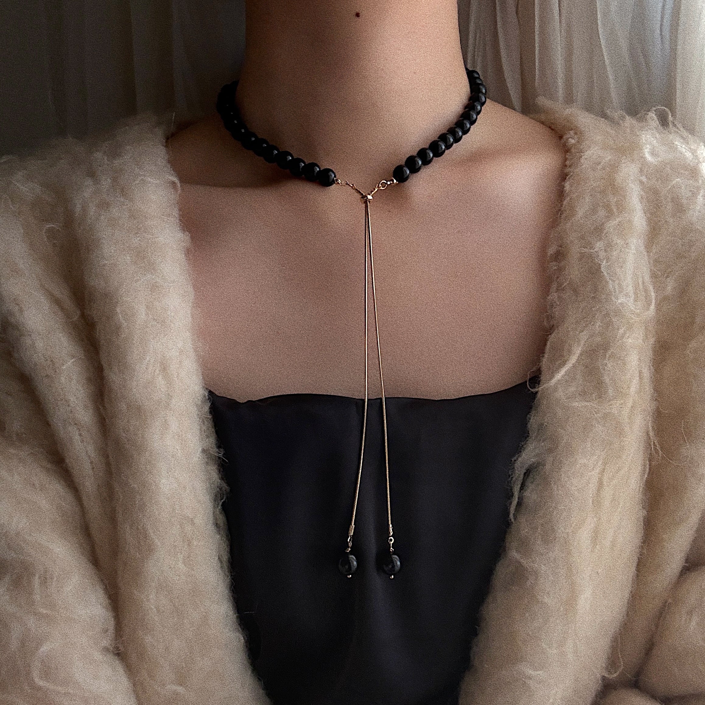 しっかりとした存在感をもつブラックオニキスのラリエットタイプのネックレス。