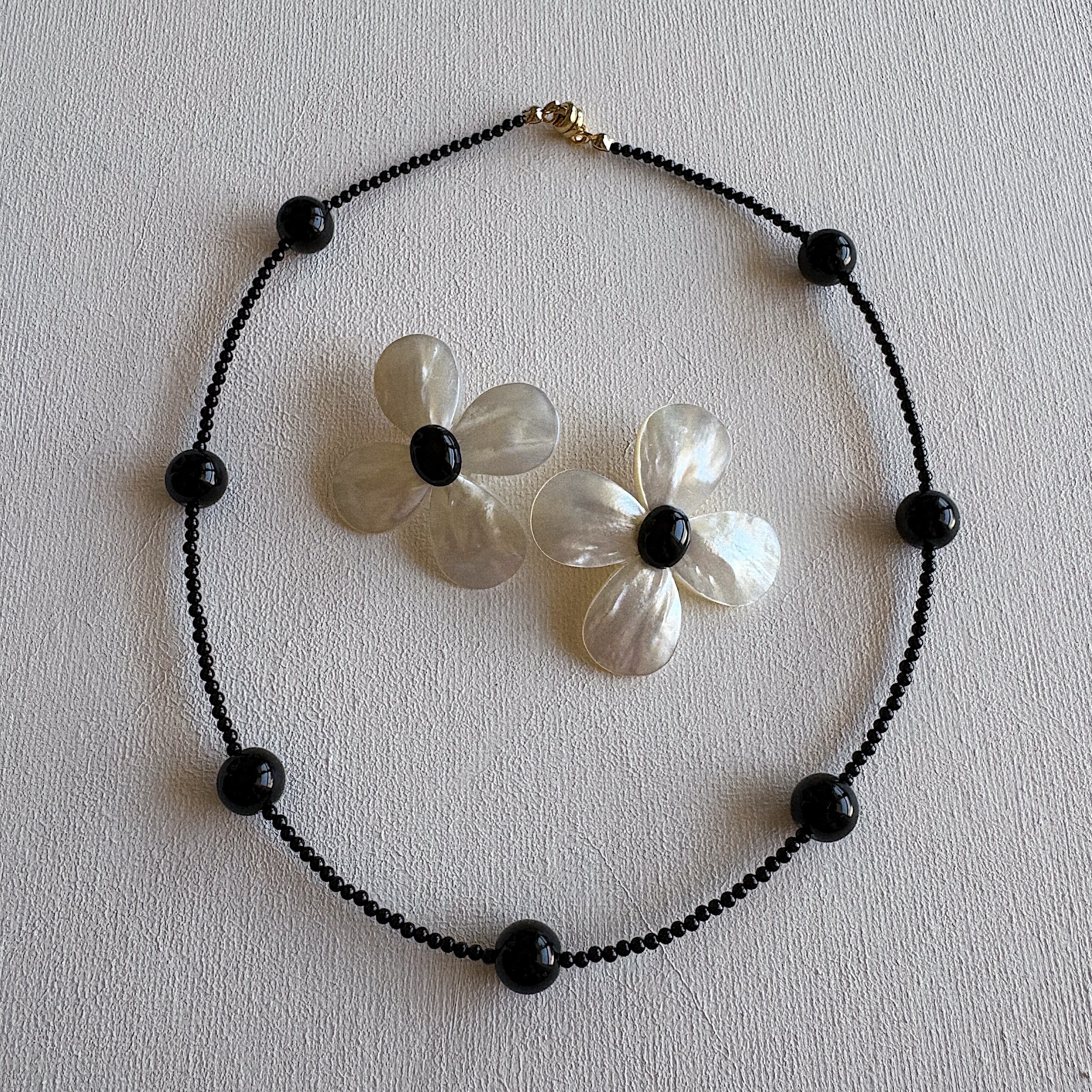 大粒オニキスの艶と重み、その周りを細かなスピネルがさりげなく囲むデザイン。